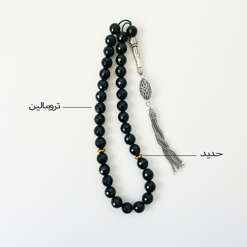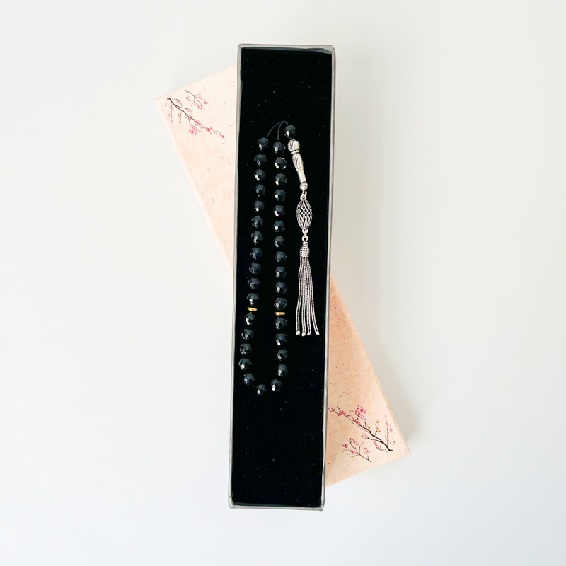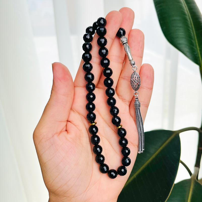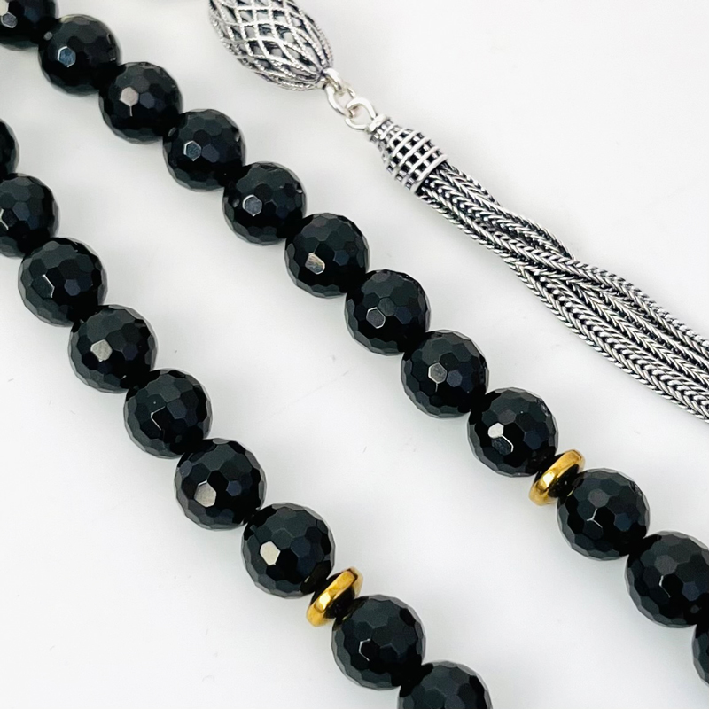 تسبیحی خاص و نفیس از سنگ طبیعی عقیق مشکی با تراش جواهری چشم‌نواز و سر نقره 925 عیار اصل، مناسب برای استفاده روزمره و هدیه‌ای خاص برای عزیزانتان.