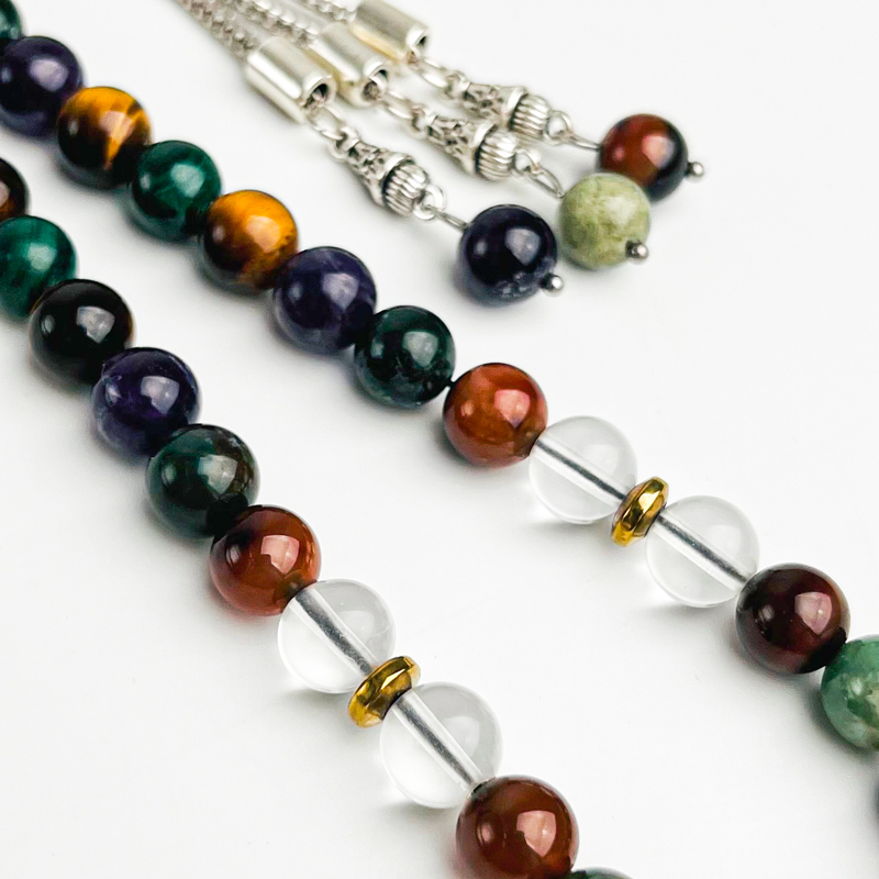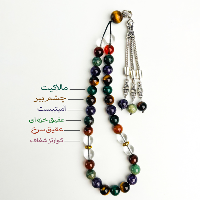• متریال: مالاکیت، چشم‌ببر، آمتیست، عقیق خزه‌ای، عقیق سرخ، کوارتز شفاف (طبیعی)