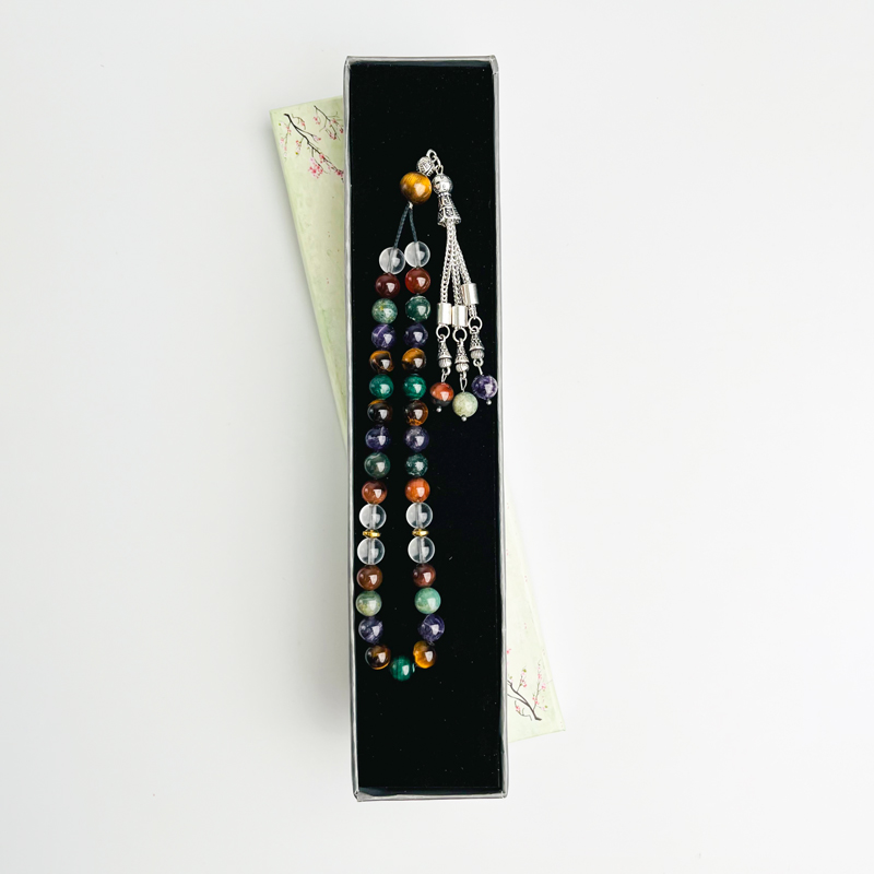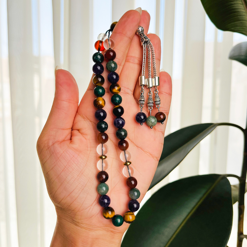 به‌دنبال اکسسوری مینیمال و معنادار هستی؟ تسبیح ماه تولد بهمن با ترکیب سنگ‌های طبیعی مالاکیت، چشم‌ببر، آمتیست، عقیق خزه‌ای، عقیق سرخ و کوارتز شفاف به تعادل، آرامش و تمرکز کمک می‌کند؛ خوش‌دست است و برای استفادهٔ روزمره عالیه.
