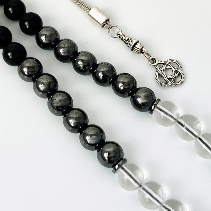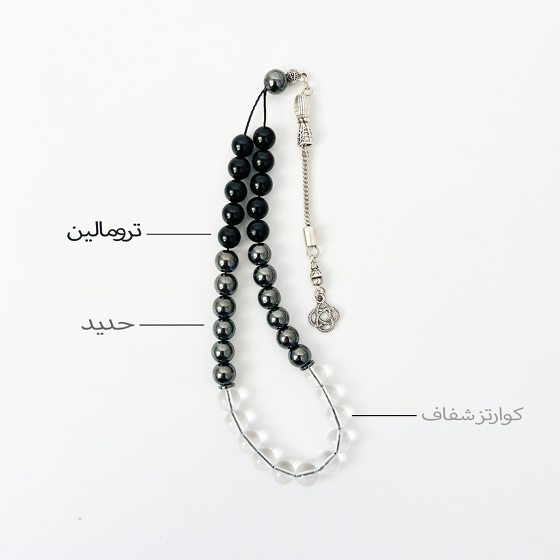 تسبیحی قدرتمند و انرژی‌بخش با ترکیب سنگ‌های ترومالین، حدید و کوارتز شفاف برای محافظت و پاکسازی انرژی‌های منفی.