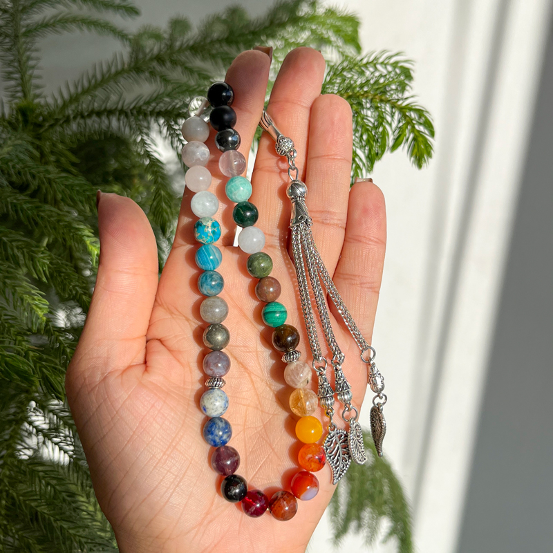 تسبیح ۳۳ سنگ مهدیس استور برای کسانی طراحی شده که به یک اکسسوری جمعوجور، خوشدست و قابلاعتماد برای استفادهی روزمره نیاز دارند. چینش ۳۳ دانه، انتخابی محبوب برای ذکرهای کوتاه و مکثهای آرامساز در میانهی روز است؛ کافی است ریتم لمس مهرهها را دنبال کنید تا حواسپرتی کاهش یابد و تمرکزتان بر «حالِ حاضر» بیشتر شود. ظاهر مینیمال و طیف رنگی خنثی/طبیعی، ستکردن تسبیح را با استایلهای روزانه—از رسمی تا کژوال—بسیار آسان میکند.