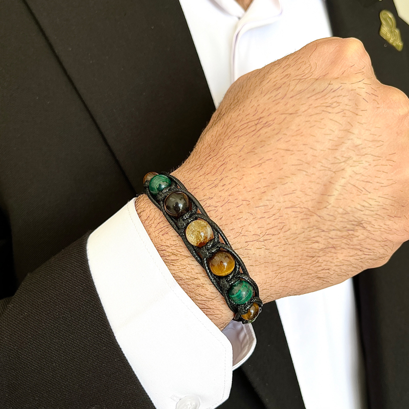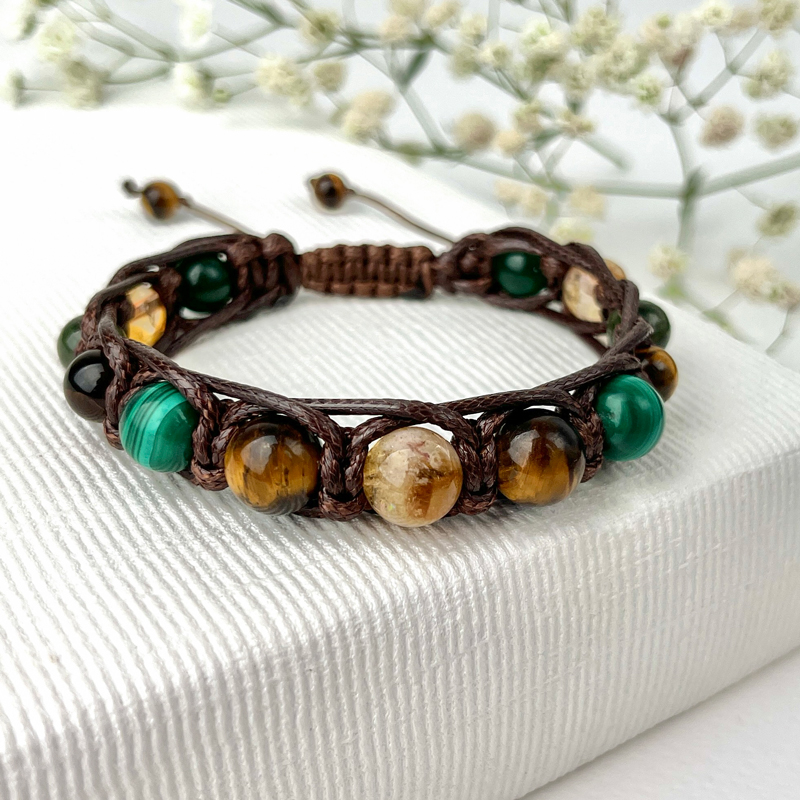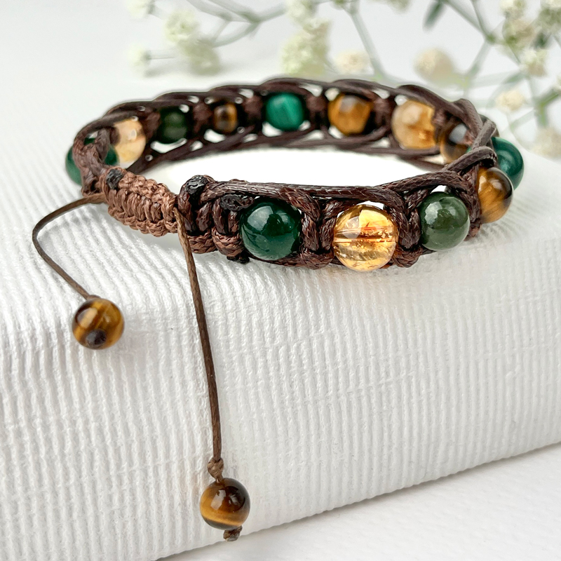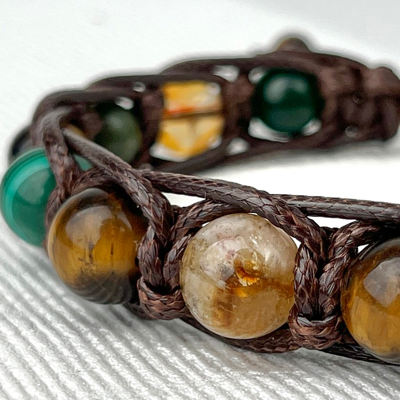 دستبند ثروت با سنگ‌های طبیعی و اصل: مالاکیت، سیترین، چشم ببر، اونتورین و یشم  برای جذب انرژی مثبت، افزایش ثروت و اعتماد به نفس.