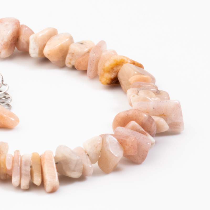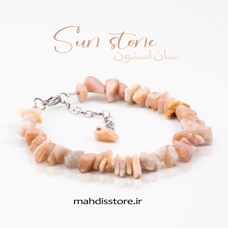دستبند چیپسی ساناستون، انتخابی مینیمال برای کسی است که میخواهد «سادگی، درخشش گرم و حالخوب» را یکجا داشته باشد. ساناستون از خانوادهٔ فلدسپار است و در برخی نمونهها درخشش سوزنیـفلزیِ چشمنوازی دیده میشود که به آن Aventurescence میگویند.
